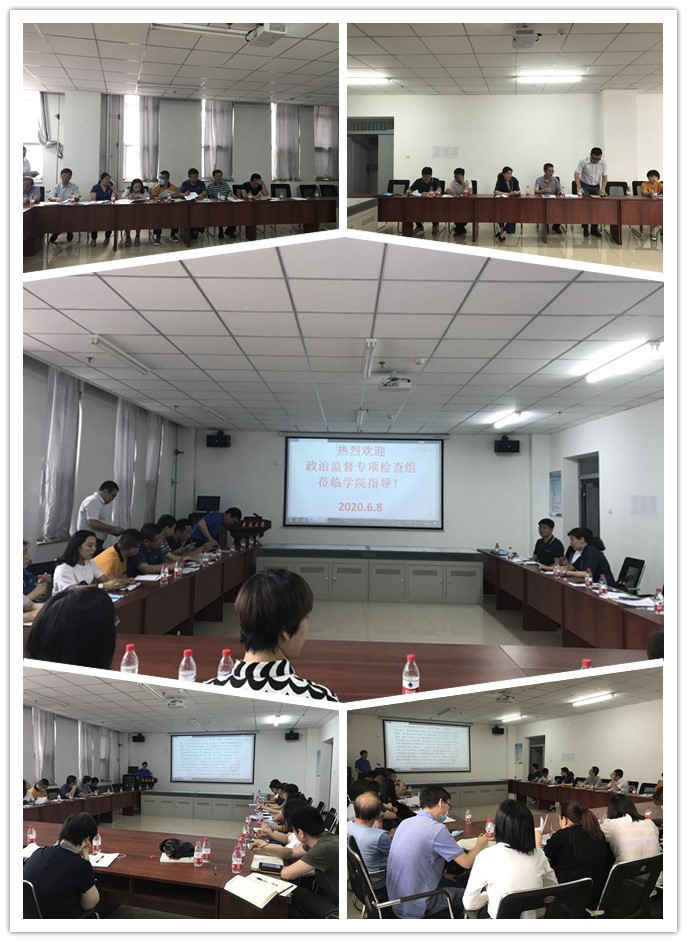 为深入贯彻落实习近平总书记关于“党中央重大决策部署到哪里、监督检查就跟进到哪里”的要求,2020年6月8日,校政治监督检查四组来我院检查工作。检查组由校纪委委员、教务处吴淑琴处长任组长,理学院孙俊伟副书记、艺术学院田维飞副书记、信息商务学院史瑞根副书记、纪委乔晓鹏科长等同志组成。学院党委委员、领导班子成员、各支部书记、各系、科室负责人20余人参加了汇报会。