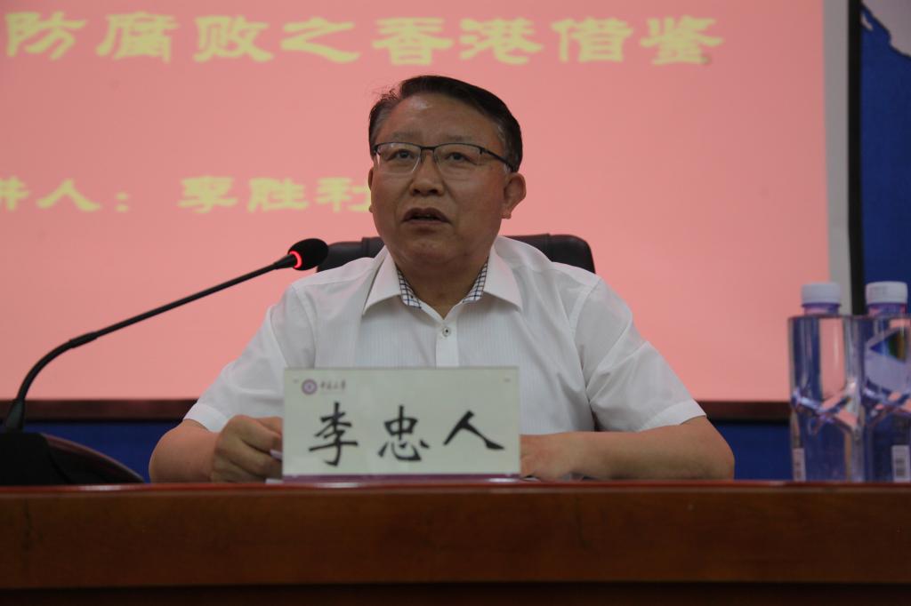 校党委书记李忠人讲话表示,李局长的讲座内容丰富、事例翔实,生动而启发性强。他指出,通过讲座,我们进一步了解了香港廉政概念的深入人心,真正做到公平与廉政紧密结合,已成为民众普遍共识;香港廉政建设制度周密完善,执法过程中严格执法、严厉惩处,真正做到了“零容忍”。他希望全体干部要不断加强自律意识,坚持政治纪律、坚持党内政治生活的每一条,坚持社会主义的价值观,真正做到讲政治讲规矩。他表示,学校将持续完善廉政制度和机制建设,使制度、规定更加合理化、规范化,形成体系,并要加大惩处力度,在自律和遵法的前提下保护好党员干部。