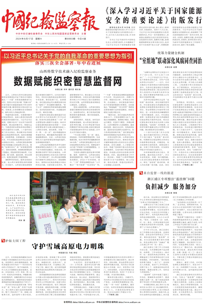 晋城市纪委监委注重把基层为民办实事平台与纪检监察工作平台对接;阳泉市纪委监委推进“三农”资金智慧监督大数据平台建设;临汾市纪委监委积极拓展信息资源……在省级智慧监督平台做大做强的基础上,山西结合省情,强化统筹,实施“一市一策、一县一品”,逐步构建起纵向贯通省市县、横向覆盖各职能部门的基础数据体系。目前,山西省纪检监察机关打造的智慧监督网越织越密,监督效能持续提升。