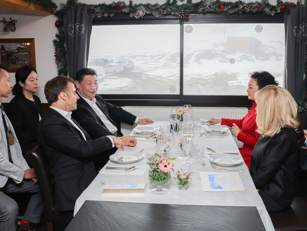 当地时间5月7日,应法国总统马克龙特别邀请,国家主席习近平乘专机来到法国西南部上比利牛斯省访问。在图尔马莱山口“牧羊人驿站”,习近平和夫人彭丽媛同马克龙和夫人布丽吉特凭窗而坐,在轻松愉快的氛围中就一些重要问题进行战略沟通。 新华社记者 姚大伟 摄