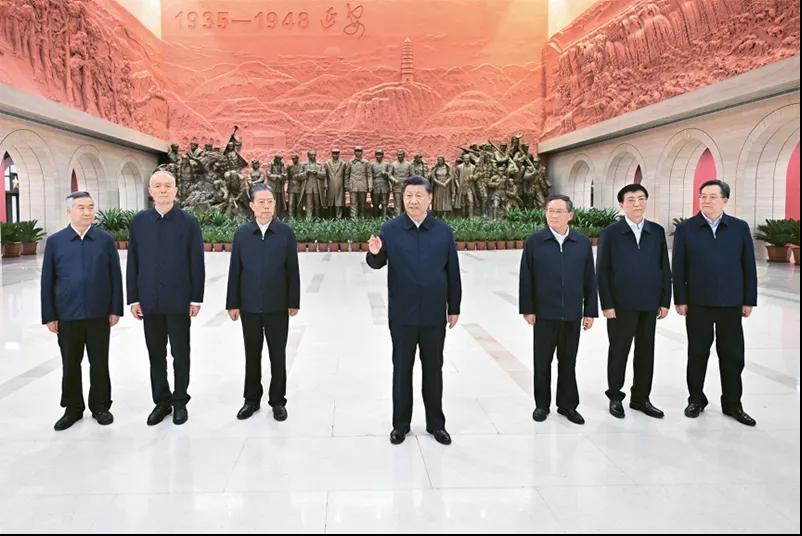 2022年10月27日,中共中央总书记、国家主席、中央军委主席习近平带领中共中央政治局常委李强、赵乐际、王沪宁、蔡奇、丁薛祥、李希,瞻仰延安革命纪念地。这是习近平在延安革命纪念馆参观《伟大历程——中共中央在延安十三年历史陈列》结束时发表重要讲话。 新华社记者 燕雁/摄