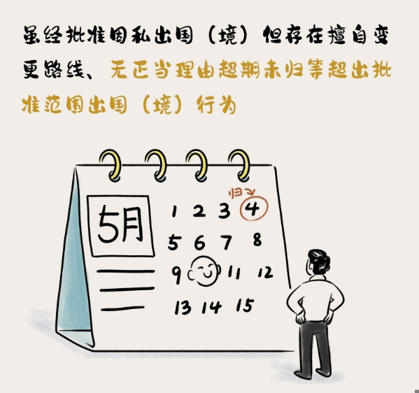 虽经批准因私出国(境)但存在擅自变更路线、无正当理由超期未归等超出批准范围出国(境)行为,情节较重的,给予警告或者严重警告处分;情节严重的,给予撤销党内职务处分。